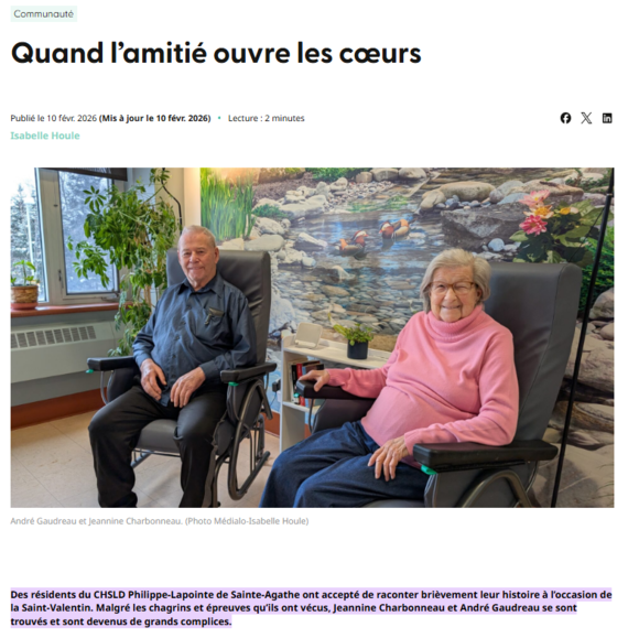 Des résidents du CHSLD Philippe-Lapointe de Sainte-Agathe ont accepté de raconter brièvement leur histoire à l’occasion de la Saint-Valentin. Malgré les chagrins et épreuves qu’ils ont vécus, Jeannine Charbonneau et André Gaudreau se sont trouvés et sont devenus de grands complices.