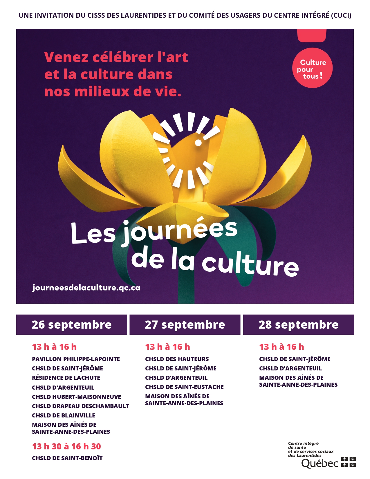 Le CISSS des Laurentides, en collaboration avec le Comité des usagers du centre intégré (CUCI), est fier d’annoncer sa participation aux Journées de la culture 2025. Pour une deuxième année consécutive, plusieurs CHSLD et une Maison des aînés des Laurentides feront partie du circuit culturel 2025, qui se déroulera les 26, 27 et 28 septembre prochains.