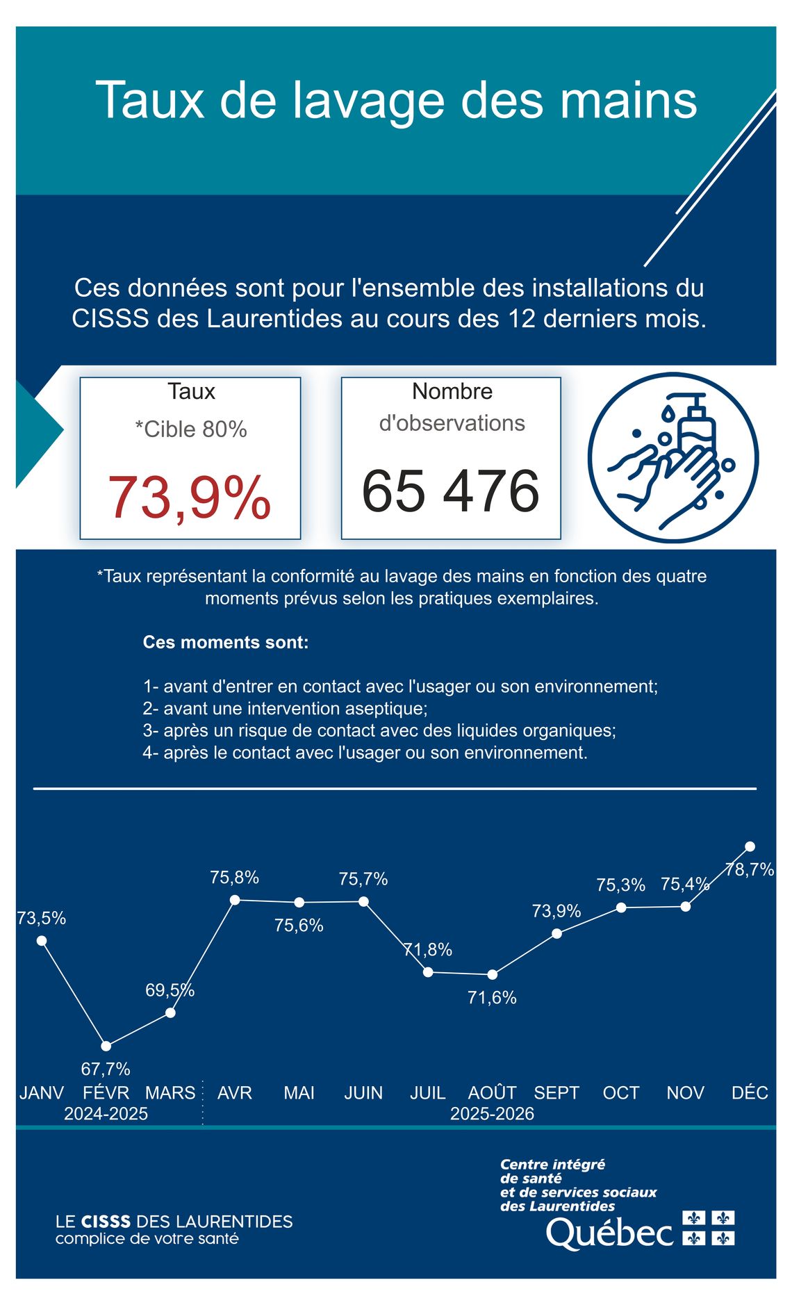 Les employés du CISSS des Laurentides ont l'obligation de se laver fréquemment les mains avant, pendant et après toute interaction avec les usagers. Afin d'assurer la conformité à cette pratique, des évaluations sont effectuées régulièrement dans l'ensemble des établissements de santé.