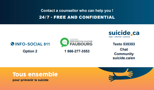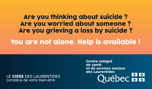 Des cartes-ressources (en format carte d’affaires) peuvent être remises aux personnes à risque de suicide, à leurs proches et aux personnes endeuillées à la suite d’un suicide. Les intervenants qui souhaitent en commander gratuitement peuvent le faire en cliquant ici. La distribution se fera aux 3 mois soit en septembre, en décembre, en mars et en juin.