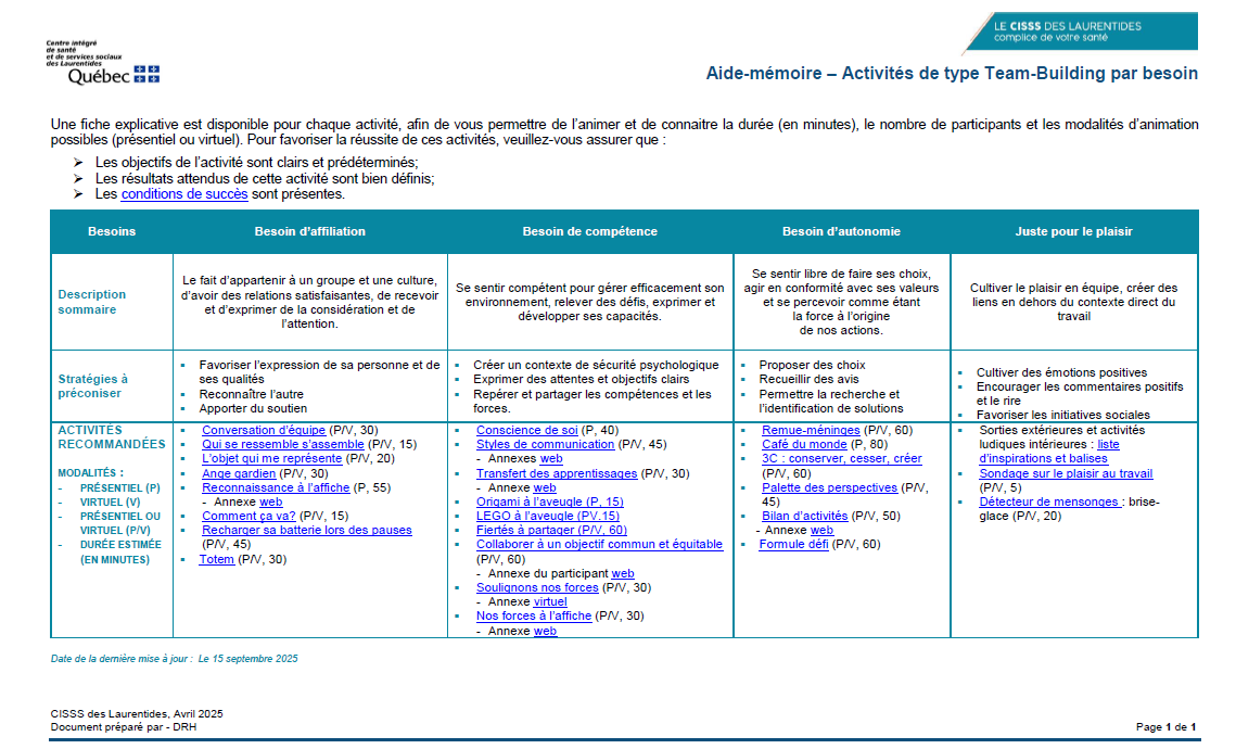 Voici des outils pour encourager la tenue d’activités de Team Building basées sur les besoins de compétence, d’autonomie, d’affiliation sociale et de plaisir au travail. La littérature et la recherche démontre que la réalisation de ces activités permet de favoriser la performance, l’engagement et la mobilisation du personnel. En effet, ces activités sont reconnues pour :