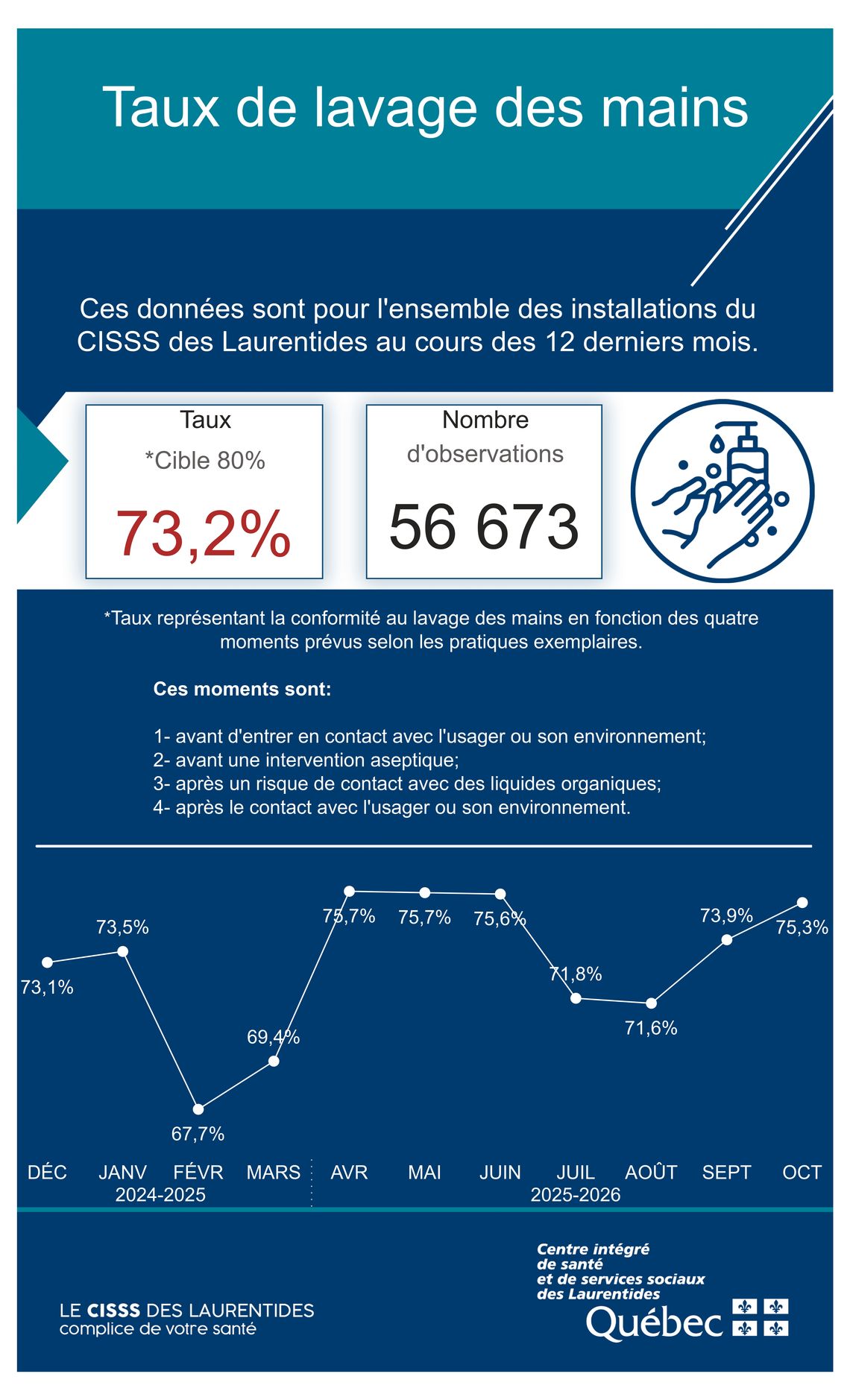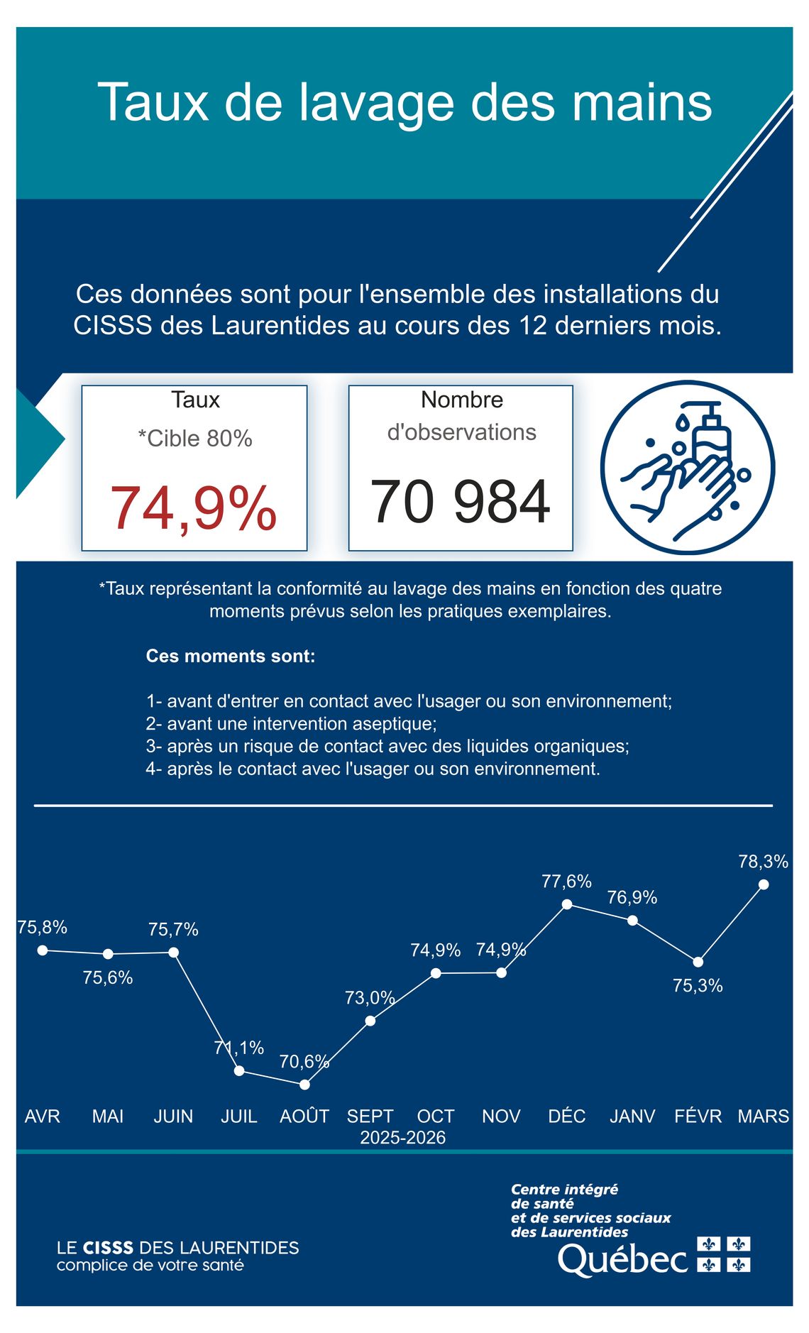 Les employés du CISSS des Laurentides ont l'obligation de se laver fréquemment les mains avant, pendant et après toute interaction avec les usagers. Afin d'assurer la conformité à cette pratique, des évaluations sont effectuées régulièrement dans l'ensemble des établissements de santé.